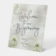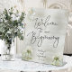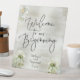 Ein Welcome To Our Beginning-Zeichen mit einem stilvollen, modernen und herzlich geschriebenen Stift, das aussieht, als ob Sie selbst das Schild geschrieben haben, mit einem weichen ätherischen, grünen und goldenen Hintergrund mit Aquarellmalungen und weißen Pfannenfiguren, zu denen zwei Tornknospen kurz vor dem Öffnen stehen; was könnte wärmender und romantischer sein.