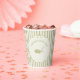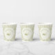 Create personalized party supplies for golfers of any age. These paper cups are ready to be customized with your own message and feature my golf club and golf ball illustration in sage green set inside of a cream and sage green scalloped ribbon frame against a sage and cream striped background.