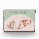 Modernes und minimales Foto für die Pflege von Säuglingen mit einem großen, grünen Bogen für das Foto Ihres Babys mit Informationen zur Geburtsstatistik. Funktioniert am besten mit einem horizontalen Foto.
