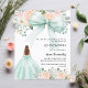 Weiß, mit einem großen, grünen Bugbogen, rosa-weiße Blume und einem Mädchen in einem grünen Kleid dekoriert. Personalisieren und fügen Sie einen Namen und Party-Details hinzu. 1 Blatt = 1 Einladung mit Druckkante bis Kante.