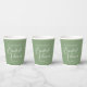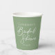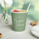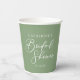 This simple solid sage green bridal shower paper cup features elegant white typography for an outdoor party in a nature setting. Minimalist script on peaceful light green decor for a rustic venue outside near a forest of trees.