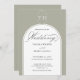 Eine grüne Hochzeitseinladung mit eleganter Skriptkalligraphie, Logostil-Monogramm und modernem Gewölberahmen. Einfache Eleganz, in Weiß und Grün. Die Koordination von Einladungen, Schreibwaren und Veranstaltungsdekoration finden Sie in meiner Sammlung von Wedding Colors. Wenn Sie andere Farben oder zusätzliche Vorlagen für passende Produkte wünschen, bitte schreiben Sie mir, dass ich sie für Sie hinzufügen soll.