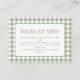 Ein klassisch-grünes Gingham-Karo umrahmt ein weißes Rechteck mit abgerundeten Ecken und einem dünnen grünen Rand, mit dem Titel "Bücher für das Baby" in charmanter Weise grün Typografie. Unten frage eine anpassbare Rhyming-Nachricht in grauem Sans Serif Schriftart die Gäste, ein Buch anstelle einer Karte mitzunehmen. Das Salbei-grüne Gingham-Muster wird auf der Rückseite wiederholt.