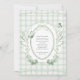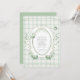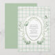 This wedding invitation features a soft, romantic design with a classic garden-inspired aesthetic. The background is a pale sage-green gingham pattern, lending a gentle country-chic feel. At the center is an elegant oval frame in muted green, accented with delicate scrollwork and a graceful bow at the top. Surrounding the frame are airy botanical illustrations—eucalyptus leaves, trailing vines, and small berries—intertwined with light, fluttering butterflies that add a whimsical touch. The typography inside the oval is refined and traditional, balancing serif and script styles for a timeless, formal look. Overall, the invitation feels fresh, serene, and nature-inspired, blending vintage elegance with a soft, modern palette—ideal for a romantic outdoor or vineyard-style celebration.