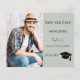 On front: Add your own vertical size photo of the graduate. A trendy muted sage green colored background, black text. Templates for a name and date. The name is written with a modern hand lettered style script. With a cap, tassel topper.