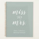 Ein maßgeschneidertes Hochzeitsplaner-Notizbuch mit "Miss to Mrs." modernem Handskriptdesign auf schlauem grünem Hintergrund.