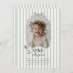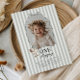Celebrate your little one's Goose themed first Birthday with this easy to edit template. Featuring a playful wavy bow border with your own custom photo inside. There is a sweet little goose with a green bow on it in the corner, along with 'One silly goose' typography, along with a sage green stripy background.