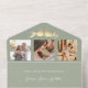 Dieses elegante und Öko-freundliche, schlanke, grüne All-in-One-Hochzeitsangebot bietet ein romantisches Imitat Goldlovebirds-Motiv, Platz für drei benutzerdefinierte Fotos und einen QR-Code für schnellen UAWG. Es ist für moderne Paare konzipiert und umfasst einen Bereich für Ihre Hochzeitswebsite und die Gästebuchdetails. Kein Umschlag erforderlich - einfach falten und mailen für eine nachhaltige, stilvolle Lösung.