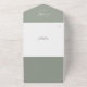 Alles in einer Hochzeitseinladung mit elegantem Signatur-Script-Namen und Monogramm-Initialen auf einem sage-grünen Hintergrund. Die Einladung enthält eine perforierte RSVP-Karte mit Ihrem Hochzeitswebsite QR Code. Entwickelt von Thisisnotme©