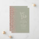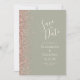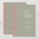 Die links Hand des eleganten modernen Hochzeitsgeschehens speichern Sie die Dattelkarte mit einer Rose Gold Imitat Glitzer Rand. Der anpassbare Text kombiniert Elfenbeinhandschrift, Copperplate und kursiv Schriftart auf einem schlängelgrünen Hintergrund. Auf der Rückseite ist ein passendes Salbei-Grün- und Rose-Gold-Design.