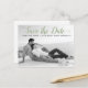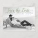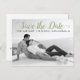 Moderne Weise grün Skript Hochzeit Save the Date Foto Postcard. Dieses zeitgenössische Typografie Save the Date Design zeichnet sich durch ein Schwarz-Weiß-Foto des Ehepaares und den Text "Save the Date" in einem modernen Script-Schriftart aus.