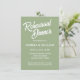 Einfache Einladungen zum Hochzeitsessen mit weißer, stilisierter Probe auf einem trendigen, schlauen grünen Hintergrund. Bearbeiten Sie Ihre Einladungen, indem Sie Namen, Datum/Uhrzeit, Ort und Kontaktinformationen mit Ihren eigenen Namen ersetzen. Wählen Sie Ihre Einladungsgröße und Ihren Papierstil aus.