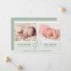 Diese moderne minimalistische Geburtsankündigung ist für zwei Neugeborene konzipiert. Die Karte verfügt über zwei große Fotos Ihrer neuen Freudenbündel mit weißem Rahmen. Unter den Bildern fügen Sie ihre Namen und Geburtsdaten in einfachen, modernen Schriften. Zwischen den beiden Namen wird ein hübscher Ampersand platziert. Ganz unten können Sie ihren Geburtstag und Ihre Namen hinzufügen. Die Vorderseite der Karte ist ein helles Salbei grün, und die Rückseite ist dunkelgrün und vollständig anpassbar - Sie können die Hintergrundfarbe ändern, mehr Fotos hinzufügen und eine individuelle Note für Liebende hinzufügen.