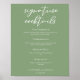 Dieses einfache, solide und grüne Hochzeitscocktails-Zeichen besticht durch seine elegante, weiße Schrift für eine Feier im Freien in einer natürlichen Umgebung. Minimalistische Typografie auf friedlichem, hellgrünem Bar-Menü Poster mit Ihren Getränken für einen rustikalen Ort draußen in der Nähe eines Waldes von Bäumen.
