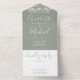Alles in einer Hochzeitseinladung mit hübschen Saitenlichtern, elegantem Schriftnamen und Monogramm-Initialen auf einem halbgrünen Hintergrund. Die Einladung enthält eine perforierte RSVP-Karte, die für Sie individuell adressiert oder links als leere Karte für die Handschrift der Adressdaten Ihres Gastes verwendet werden kann. Entwickelt von Thisisnotme©