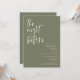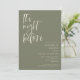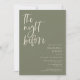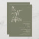 Minimalistische Hochzeitsdinner mit moderner Probe-Schriftart, in der "die Nacht vor" steht. Die Hintergrundfarbe ist sage grün.