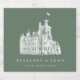 These wedding wine bottle labels feature a vintage illustration of a castle, which you can replace with an image of your destination wedding venue. Serif lettering lays out the couple's names and the date of the wedding, on a sage green background.