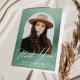 Eleganter Abschluss Dankeschön-Karte mit dem Foto des Absolventen in einem Bogen-Rahmen mit einem schlauen grünen Aquarellhintergrund. "Danke" wird in einer weißen, modernen Kalligraphie-Skript mit dem Namen, der Schule und dem Abitur angezeigt, wie unten gezeigt. Die Innenseite des Foto Abschluss Dankeschön-Karte bietet Platz für Ihre getippte oder handgeschriebene Nachricht. Auf der Rückseite der Karte befindet sich ein silbergrüner Aquarellhintergrund.