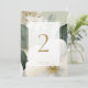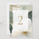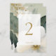 Schick und elegant. Diese wunderschöne Hochzeitsfeier-Tischnummer besticht durch einen hübschen Blumenstrauß in Aquarellfarben mit Goldakzenten und einem zeitgenössischen Schriftart in der Nachahmung von Set in einem weichen, weißen Overlay mit einem dünnen weißen Rahmen und einem schlauen grünen Hintergrund. Das Design wird hinten wiederholt.