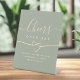 Set einen hellen Ton an Ihrem Empfang mit diesem stilvollen Weise grün Hochzeit offenen Bar. Mit eleganter Kalligraphie, die "Cheers" sagt, ein romantisches goldenes Seil Herz und ein frech Zitat: "Die Getränke am heutigen Abend sind gratis. Die Geschichten von morgen sind unbezahlbar." Eine lustige und funktionale Art, die Gäste zur Bar zu führen und Ihrem Hochzeitsdekor Charme zu verleihen.