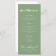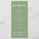 Dieses schlichte, solide und grüne Dinner-Menü bietet elegantes weißes Drehbuch für eine Feier im Freien in einer natürlichen Umgebung. Minimalistische Typografie auf friedlichem, hellgrün für einen rustikalen Ort außerhalb eines Waldes von Bäumen.