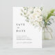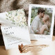 Ein raffiniertes Salbeigrün und weißes florales Design für die Save-the-Date-Karte mit weichen Wasserfarben-Blumen und einem eleganten Foto auf der Rückseite.