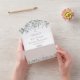 Das Ganze in einer Hochzeitseinladung mit hübschem, grünem Blattwerk und eleganter moderner Typografie. Die Einladung enthält eine perforierte RSVP-Karte mit Ihrem Hochzeitswebsite QR Code. Entwickelt von Thisisnotme©