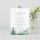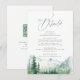 Aquarell üppiger grüner Kiefernwald und nebliger Berg mit moderner Sage-Schrift, elegant und romantisch, detaillierte Karten mit QR-Code für eine boho-rustikale Hochzeit und eine Bergwald-Hochzeit im Frühling und Sommer.