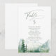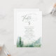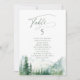 Aquarell üppiger grüner Kiefernwald und nebliger Berg mit moderner Sage-Schrift, elegante und romantische, großartige personalisierte Tischkarten für eine boho-rustikale Hochzeit und eine Bergwald-Destination-Hochzeit im Frühling und Sommer.