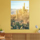 Das Bild zeigt eine Wüstenlandschaft mit mehreren Saguaro-Kakteen unterschiedlicher Höhen, die inmitten von trockenem Pinsel und Kakteen mit stachelbrauner Birne stehend sind. Der Vordergrund wird von einem Cluster von grünem, stachelbraunem Kakteen dominiert. Im Hintergrund sind die Berge unter einem klaren, hellblauen Himmel sichtbar. Die gesamte Farbpalette ist gemütlich, die Szene wird von erdigen braunen und grünen Farbtönen dominiert.