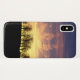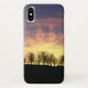 Hinter den Silhouetten eines barfußlosen Wintertresors segelt ein Phantom-Schiff durch die Wolken eines Sonnenuntergangshimchs.
