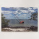 Die Szene auf diesem Jigsaw Puzzle ist ein Originalfoto von ZoeSPEAK eines Segelbootes in flachen Gewässern. Im Foto ist das rote Schiff auf einer Seite geneigt, gerahmt von Mangroven, einem Sandstrand und einem großen blauen Himmel, der mit duftenden weißen Wolken gefüllt ist.