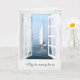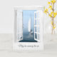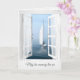 Offenes, weißes Fenster mit schmalen Vorhängen und Segelboot auf einem ruhigen, blauen See Wasser für das allgemeine Beileid. Alle Texte können geändert werden.
