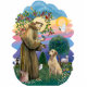 Der Heilige Franziskus, der Schutzheilige der Tiere, wird hier mit dem Segen eines gelben Labrador Retriever gezeigt. (Die Figur des Heiligen Franziskus wurde von Giotto aus dem Meisterwerk des Heiligen Franziskus aus dem 14. Jahrhundert übernommen.