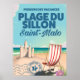 St. Malo, Frankreich Ferienposter mit Sandburg und Liegestuhl. Vintages französisches Urlaubspenster.