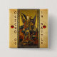 Einzigartige und fantastische Beschreibung des heiligen Michael Erzengels als mittelalterlicher Ritter .Tempera und Gold auf der Tafel.Gonzalo Pérez, Anfang des 15. Jahrhunderts .Ein elegantes und klassisches Design mit einem alten Pergament und roten Rubinen.
