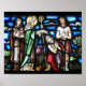 Vintages Buntglasbild von St. Patrick mit seinen Anhängern, die einem Mann einen Segen geben.