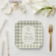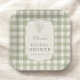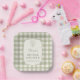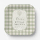Papier-Teller für die Hochzeitsdusche-Party, entworfen mit einem weichen salbeigrünen Gingham-Muster. Der saubere, klassische Stil passt gut zu garteninspirierten und zeitlosen Hochzeitsdusche-Themen. Geeignet für Hochzeitsduschen, Mittagessen und Vorhochzeitsfeiern. Vollständig anpassbarer Text mit einem druckfertigen Design für Partytischwäsche.