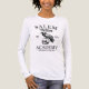 This Halloween season t-shirt features a playful vintage design that's perfect for those who enjoy gothic aesthetics with a sense of humor. It showcases a raven perched atop a human skull, evoking classic symbols of the macabre. Above this striking motif, the text “SALEM Witch” is prominently displayed, while “ACADEMY” is positioned below the raven and skull. The phrase “Hexcellence in Every Class” sits beneath the skull adding a clever pun to the design. This tee is perfect for those who enjoy a fun and spooky Halloween vibe, history buffs with an interest in colonial America’s witch trials period, or anyone who appreciates a good pun.