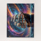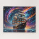 Ein großes Schiff unter Vollsegel gleitet durch ein ruhiges Meer unter einem farbenprächtigen, magischen Himmel aus Galaxien, Planeten und Sternen. Schönes, traumhaftes Bild.