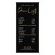 Luxuriöse Preisliste Rack Card der Dienstleistungen in Schwarz und Imitat Gold mit Platz für Ihr Logo, Geschäftsdetails und Ihre Dienstleistungen Preise. Ideal, um als Preismenü für Ihren Salon oder Ihre Boutique zu dienen. Der moderne, schicke und trendige Schriftart des Imitats gold verleiht dieser Rack-Karte des Preisführers eine schicke und trendige Note. Benutzen Sie es als Servicekarte für Lash & Brows, Nagelnagel, Friseursalon oder andere Produkte oder Dienstleistungen.