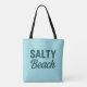 Teal leicht abgenutzte Vintage- und moderne Schriften ergeben einen spielerischen, subtil sarkastischen Slogan auf einem wunderschönen Meerwasserglas-Blau. Ob du vom Seewind salzig bist oder voller salziger Einstellung, dieser Grafikdruck 'Salty Beach' Tote Bag ist die ultimative Strandtasche und stilvoll genug, um als alltägliches Statementstück verwendet zu werden.