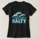 Giant whitecap waves roll toward the beach in this retro style coastal graphic. Cream vintage SALTY text makes a bold contrast against the teal blue ocean. Made for beach bums, surfers, sun seekers and anyone living on island time. This t-shirt is a great way to add seaside vibes to your outfit. | Pro-Tip: For vibrant colors we recommend vivid printing for most apparel. For white apparel select classic printing.