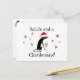 Hier ist wieder dieser Party-Typ, die Cabernet-Katze, mit seinem Hut aus dem Weihnachtsmann und seinem Glas Wein, dieses Mal ein Weiß anstelle eines Cabernet, denn heute dreht es sich alles um Chardonnay (hey hey)! Sag es mit ihm: Saluté und ein Chardonnay! Ein lustiges Weinangebot, das oft auf Weihnachtsfeiern gehört wird. Hier kann man das Design auf einer Postkarte sehen, mit lustigen Retro-Texten, bordeauxroten Stern-Dekorationen und der schwarzen Cartoon-Katze selbst, die für die Saison in einem roten Hut mit schwindelerregend weißem Trimm gekleidet ist.