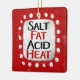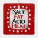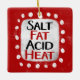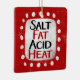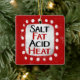 "Salt Fat Acid Heat" ist ein lustiges Textdesign mit weißer Akzent-Form, umgeben von weißen, weißlichen, weißlichen, weißgetönten Punkten.