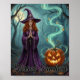 This poster features a serene witch in a purple robe and hat standing in a spooky forest, hands clasped in prayer beside a glowing jack-o’-lantern with swirling mystical energy. Finished in an oil paint art print.