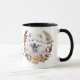 Ein hübscher Herbstkranz in den Farben Zimtbraun, Bräune und Creme umgeben das Aquarellbild eines wunderschönen weißen Samoyed Dog. Das Bild wird zweimal auf der Tasse gedruckt, wobei der eigene Text dazwischen liegt.