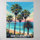 A picturesque view of the San Clemente coastline in California featuring palm trees, a sandy beach, and a distant pier under a vibrant sky.