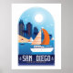 Schönes Kunstwerk von San Diego California mit einer Vintagen Strandsommerlandschaft und der phantastischen Landschaft der Stadt. Tolle Geschenkidee und Souvenir.