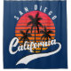 Duschvorhang San Diego mit Retro-Design, mit einem Sonnenuntergang und Palmen auf Old Glory Blue individuell einstellbare Hintergrundfarbe. Dieses Design hat auch Kalifornien in einem handgeschriebenen Schriftart mit einem Swash-Schwanz-Glyphe für diesen stilvollen Retro-Look. Dieser Duschvorhang ist nur für Sie, wenn Sie aus San Diego sind oder Sie als Geschenk oder Andenken für jemanden erhalten können.